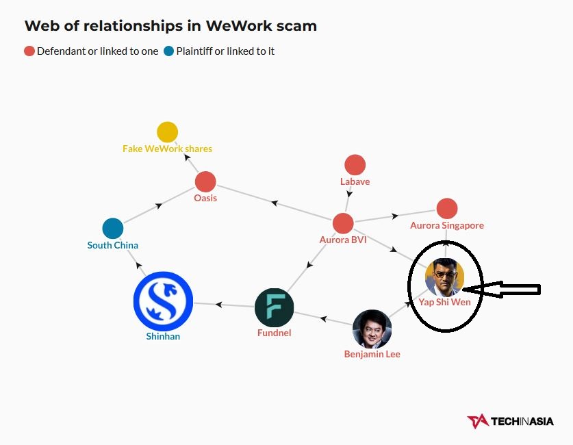 Aurora’s subsidiary, Oasis Buono Limited, supposedly held WeWork shares. Shinhan’s affiliate, South China, would buy Oasis and in effect own the equity.