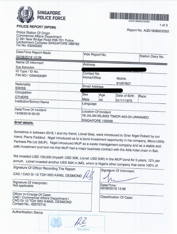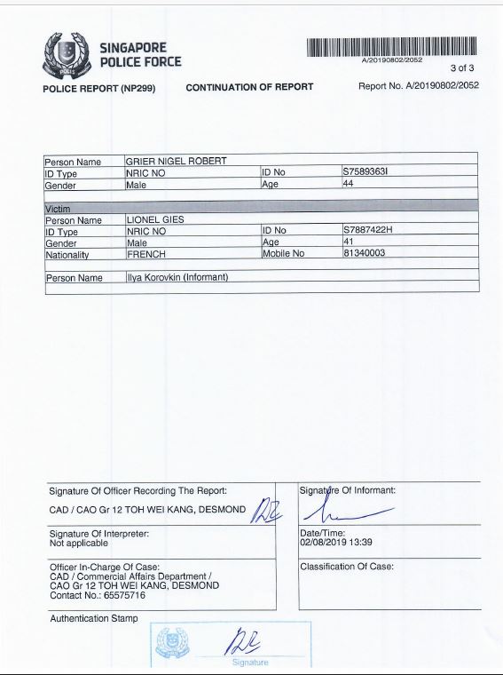 A Singapore police report that was filed when the Griers suddenly disappeared, leaving victims holding the bag. He used phony business addresses to hide his tracks.